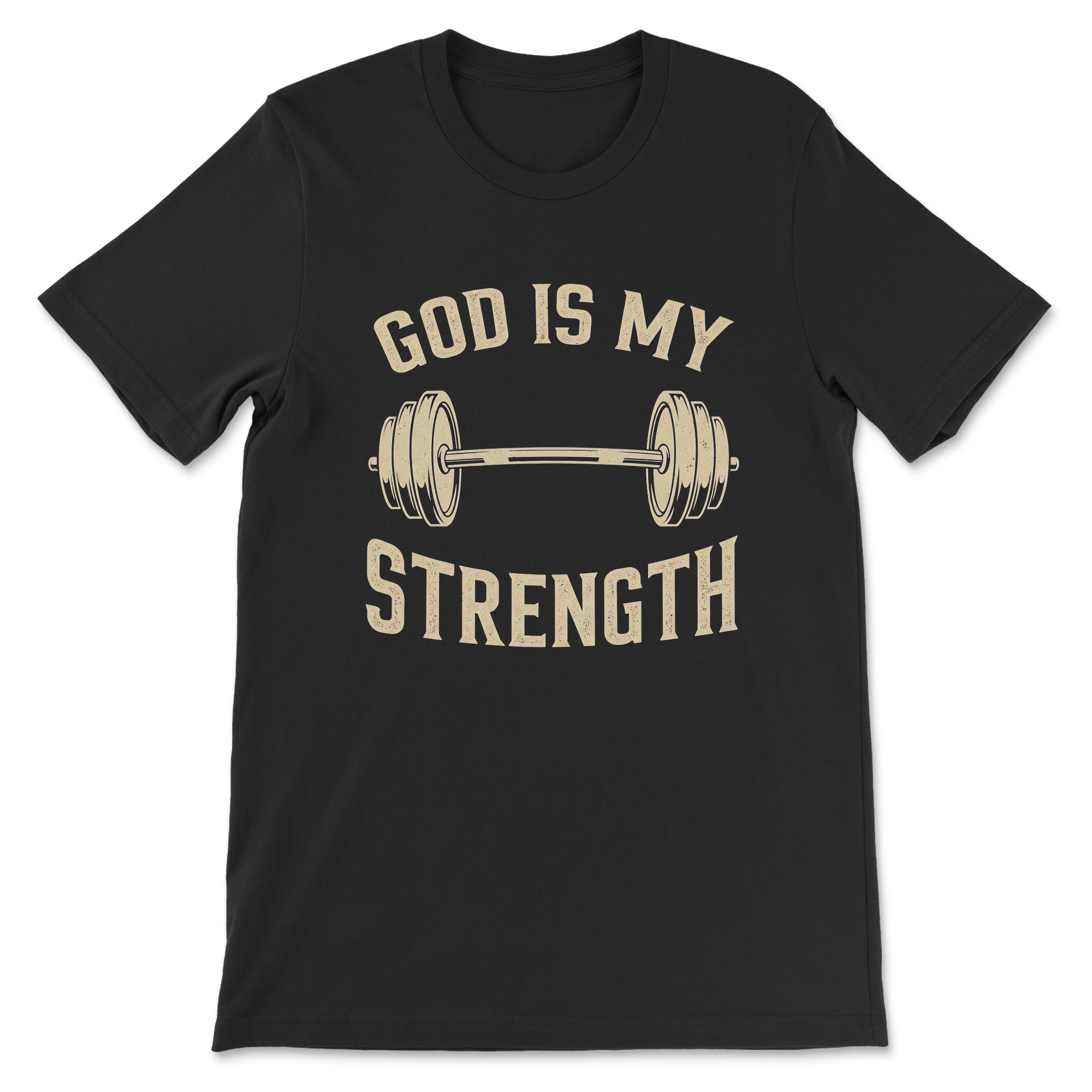 Adult unisex tee with text God Is My Strength; designed with a barbell.