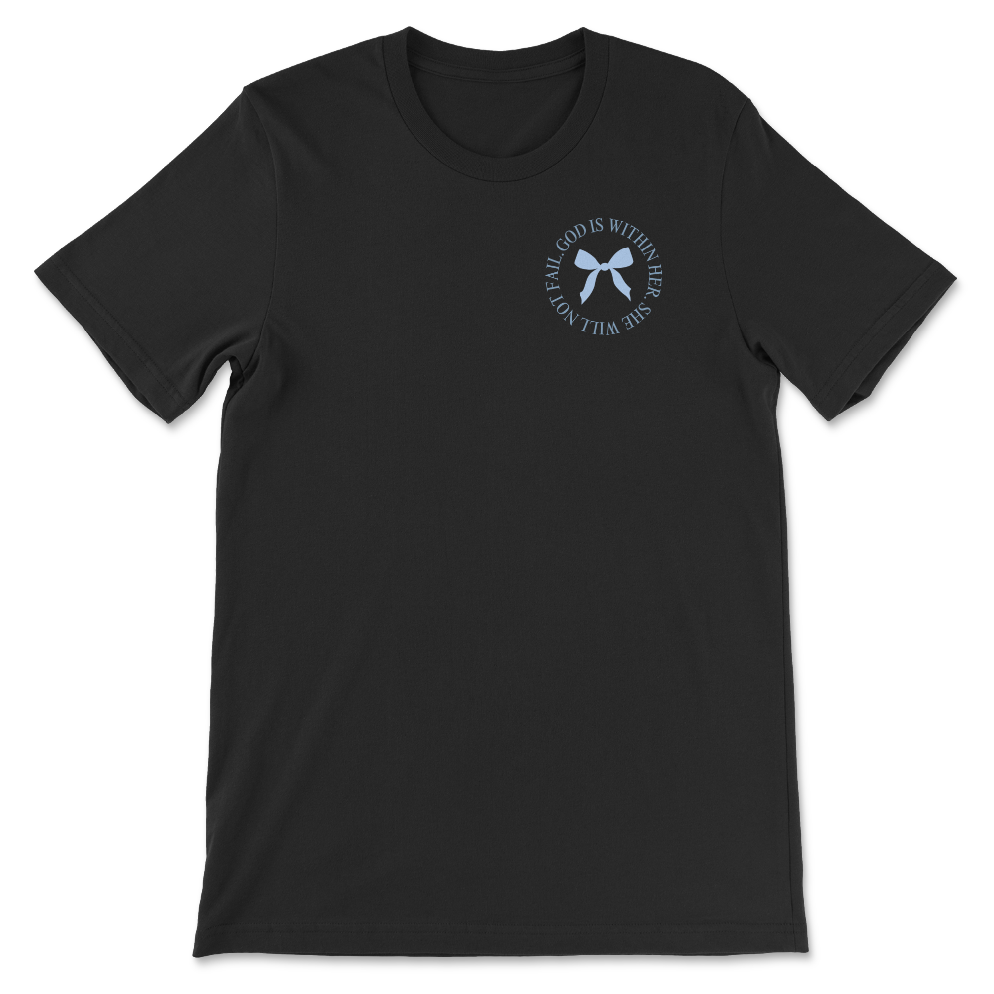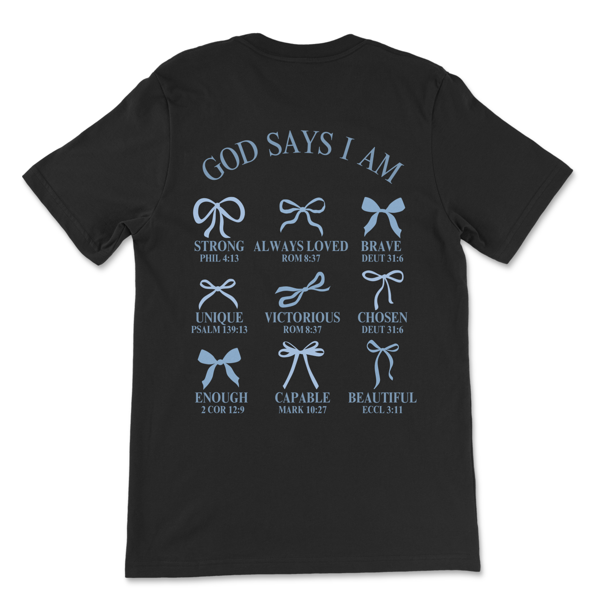Adult unisex tee with multiple reference bible verses and characteristics listed; designed with blue bows.