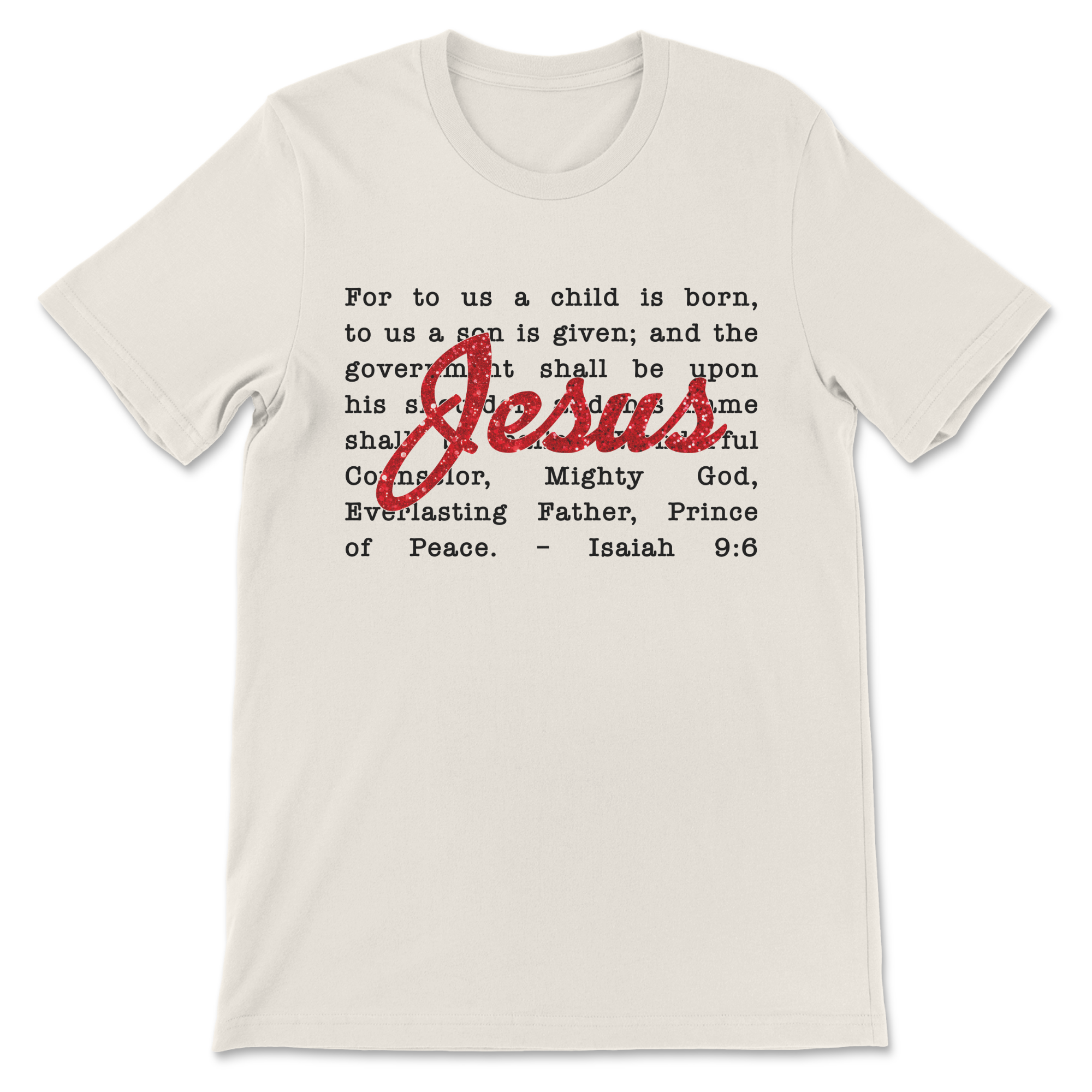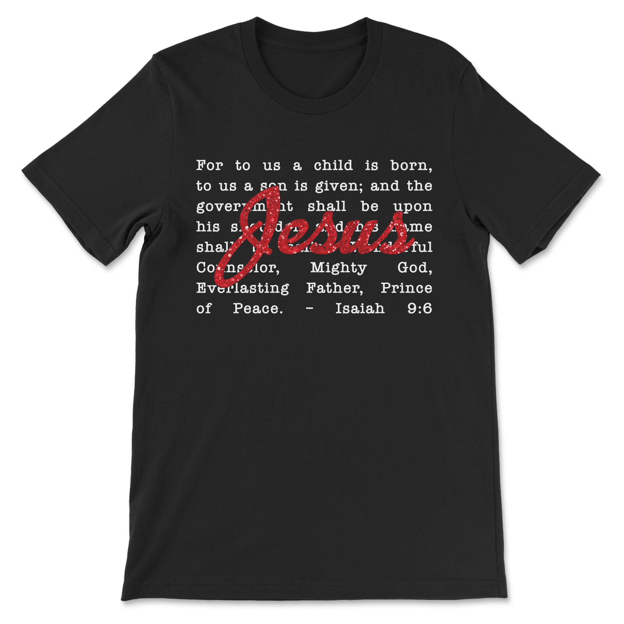 Adult unisex tee with bible verse Isaiah 9:6; designed with the name of Jesus in red text over the verse.