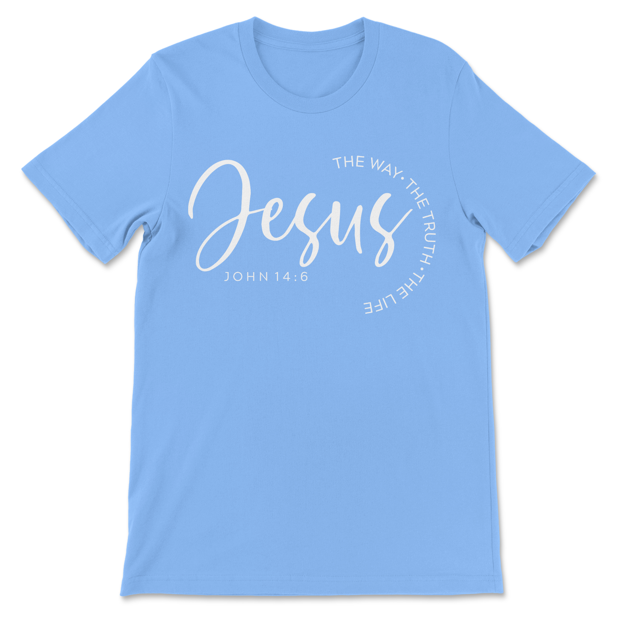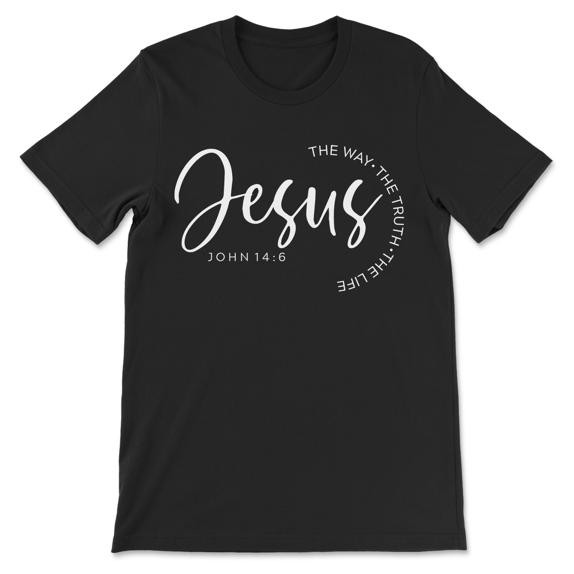 Adult unisex tee with reference to bible verse John 14:6; designed with white text Jesus - the way, the truth, the life.
