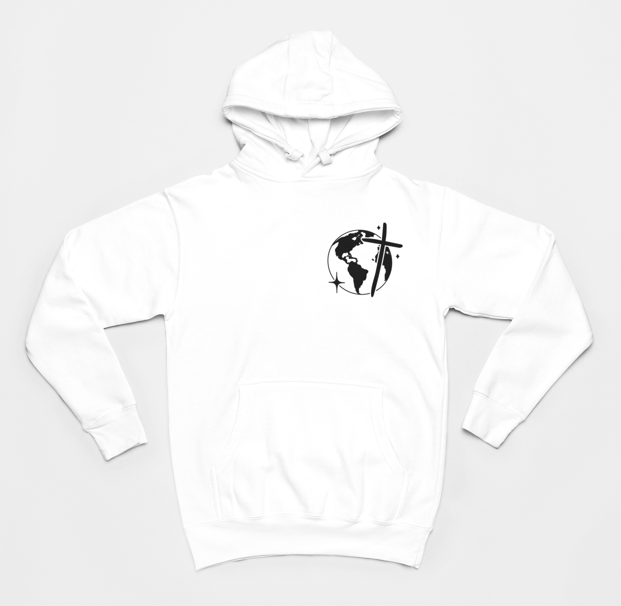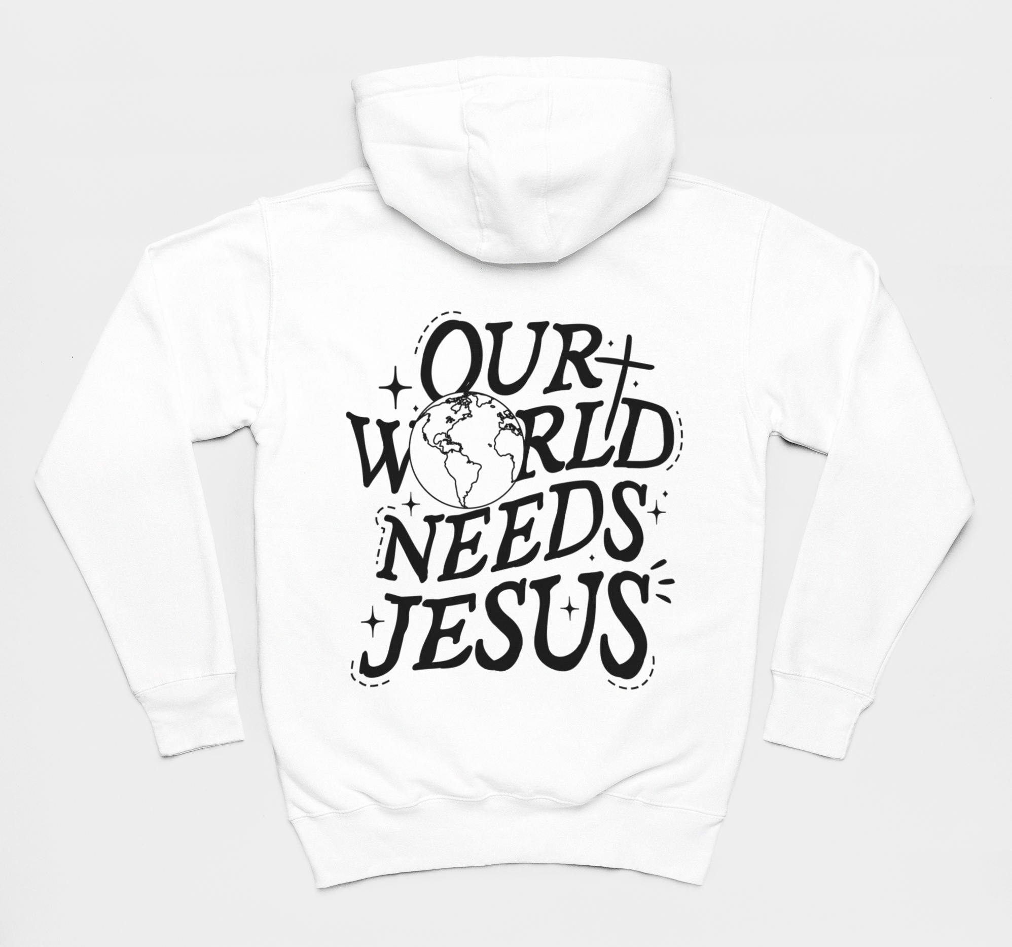 Adult unisex hoodie with text Our World Needs Jesus; designed with a cross and a globe.
