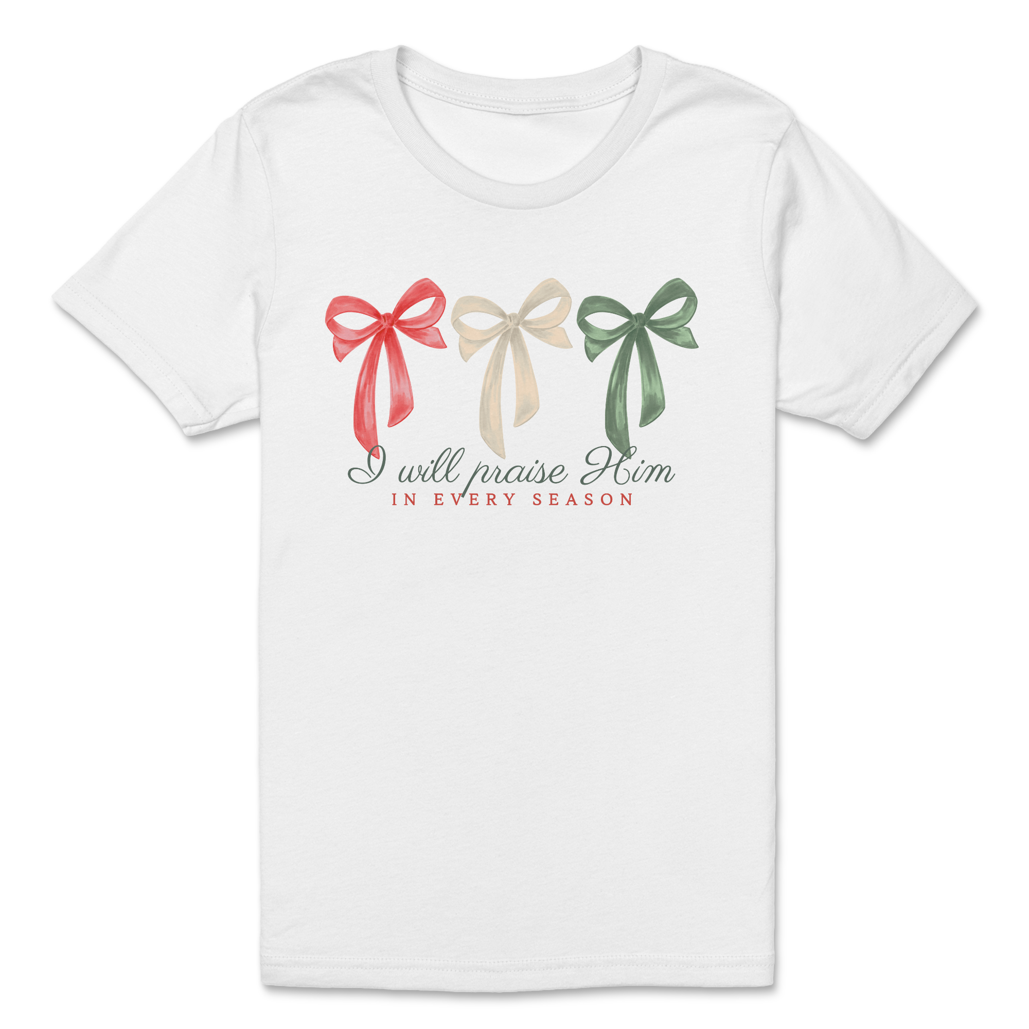 Youth unisex tee with text I will Praise Him in Every Season; designed with colorful bows.